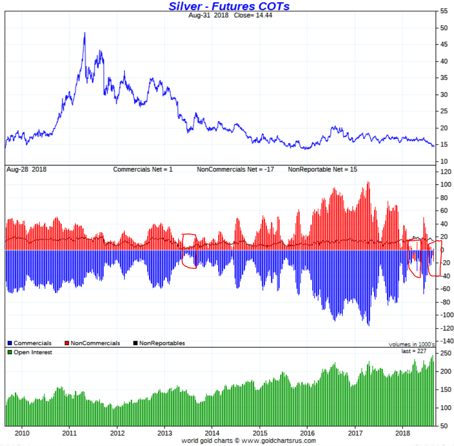 How to read this chart? The extreme levels in center pane are the ones to focus on. The closer positions to the zero line, the deeper the bottom that will be set. This may vary if the silver market is in a bull market vs a bear market, but the point is that extreme positions cannot last for a long time. Note how each previous instance of similar readings got followed by a powerful short to medium term rally, see red circles on the chart.