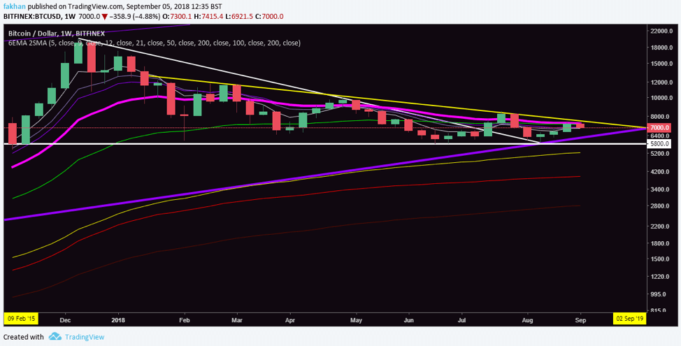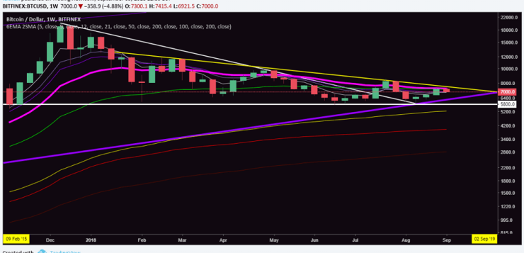 Even if Bitcoin (BTC) does not move sideways for the next few weeks and the price falls all the way down to the trend line or to the $5,800 support and bounces back up, it will serve as a similar confidence booster for the bulls and the bearish sentiment will weaken significantly. Currently, the bearish sentiment is one of the strongest it has ever been as the number of shorts on exchanges like Bitmex and Bitfinex is on a constant rise. To contrarians, this would be a sign of a trend reversal as the market has become overly bearish. However, given that the volume is so low that just a couple of million dollars can move the price significantly, there does remain a possibility that the market can overreact.