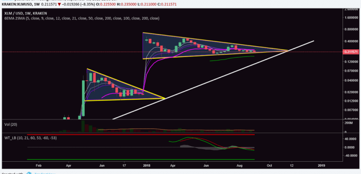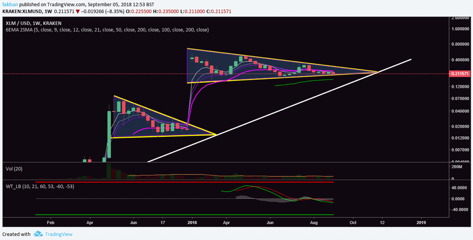 Stellar (XLM) seems to be at a stage where it is just waiting for the rest of the market to recover. The weekly chart above for XLM/USD shows that the price has already closed four candles below the 21 Week EMA and could now close the fifth candle below the 21 EMA as well. This means that Stellar (XLM) has had its correction and the price is now range bound, waiting for the rest of the market to recover. Stellar (XLM) has a history of consolidating candles on the weekly time frame before a break out occurs. This break out is very abrupt and aggressive in nature as we have seen in the past.