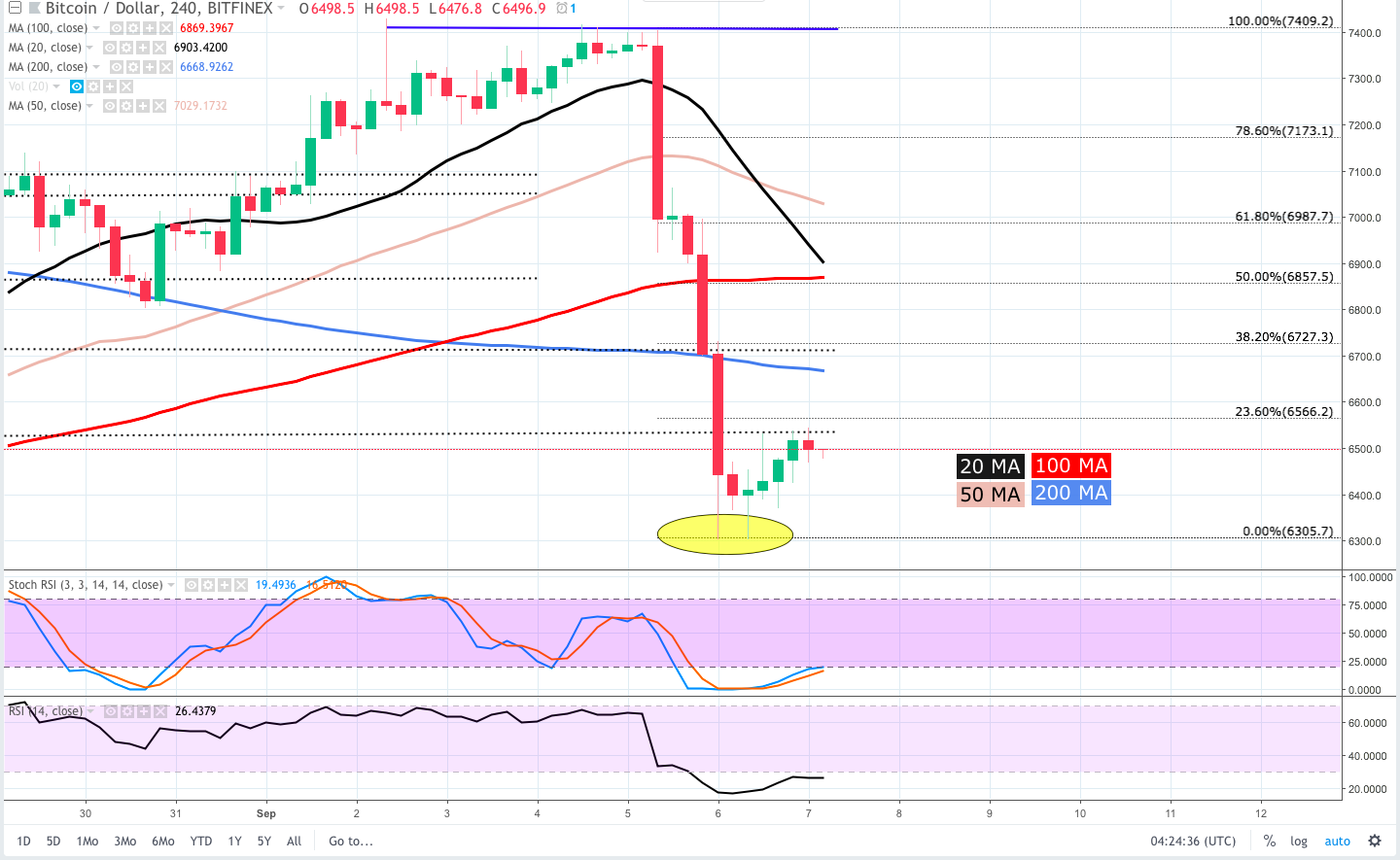 BTC formed a double bottom at $6,308 and a previous support at $6,537 now serves as resistance. At the moment it appears that $6,500 is standing as a psychological resistance. We can expect resistance at the 20-MA and the 200-MA which nearly aligns with the 38.2% Fib retracement level. Furthermore, the 20-MA is en route to crossing below the 100-MA at the 50% Fib retracement level ($6,857).