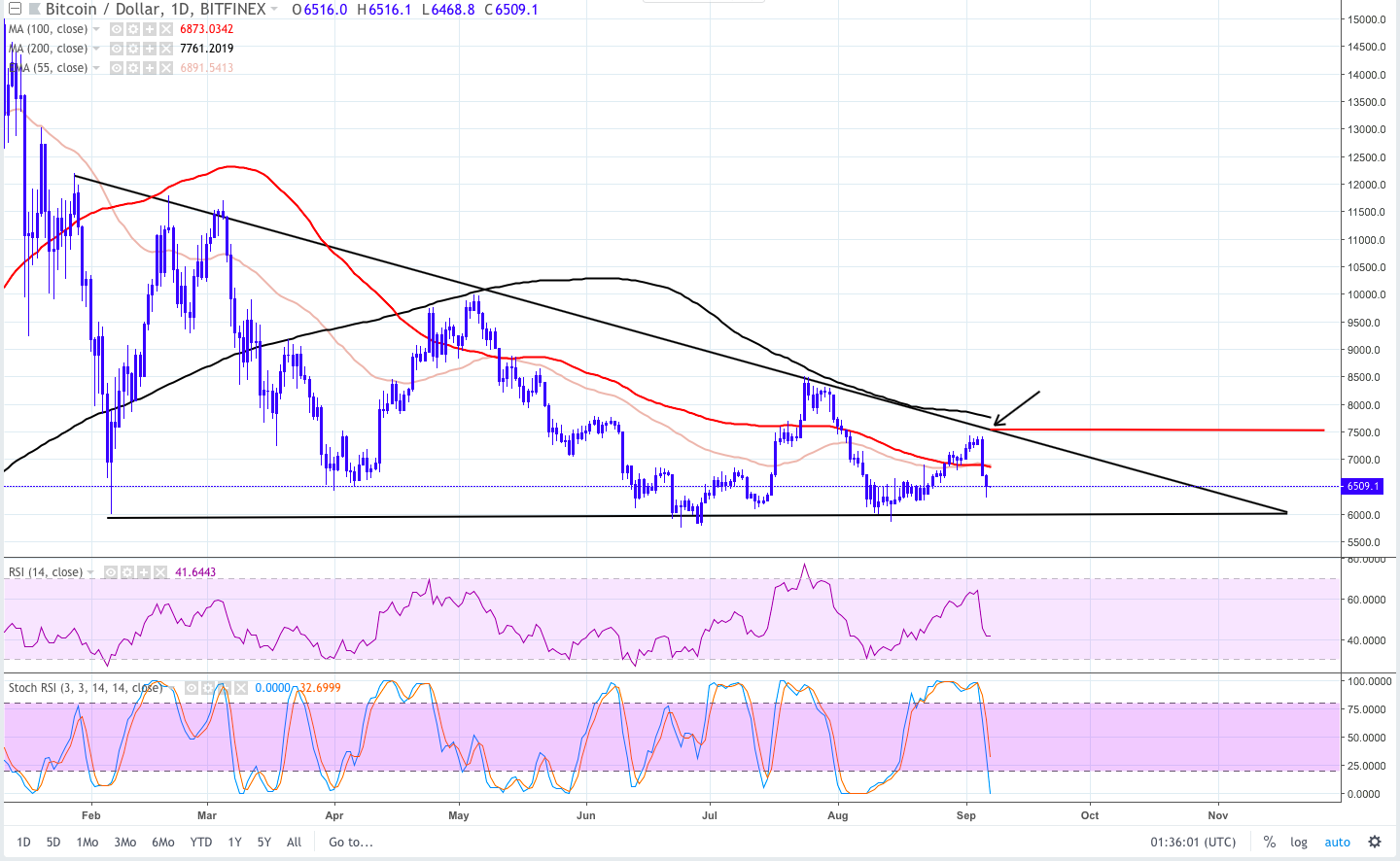 Bitcoin has now given up 2.5 weeks worth of gains and is unlikely to close above $7,429, which makes the possibility of a bear break more likely than the inverse scenario.