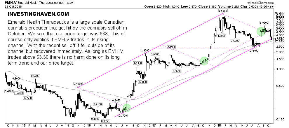 The same accounts for Emerald Health Therapeutics. It got hit hard, and fell even outside of its long term rising channel shown on below chart.