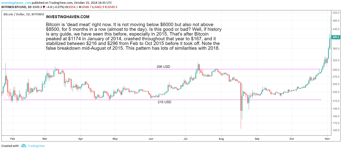 The most striking similarity is with 2015. That’s after Bitcoin peaked at $1174 in January of 2014, crashed throughout that year to $167, and it stabilized between $216 and $296 from Feb to Oct 2015 before it took off.
