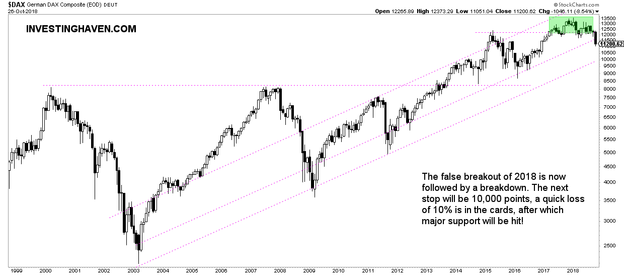 The German DAX showed a failed breakout in 2018. Its 2016 uptrend is already broken, rather hard.
