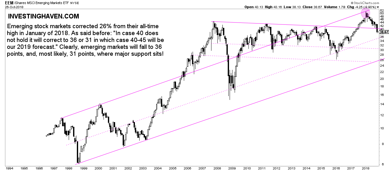Emerging markets were the first ones to give up this year. The breakdown (after a failed breakout) is confirmed! Now it is a matter of holding the 30 to 36 area.