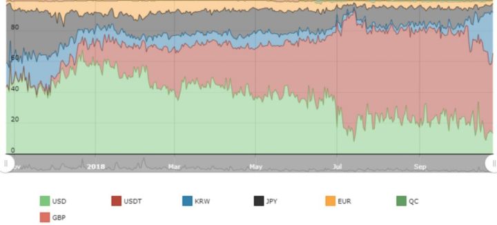 Since the start of October 2018, the cryptocurrency trading volume in South Korea has spiked. A chart by CryptoCompare shows KRW trading volumes on certain days in October accounting for almost 50 percent of the total market share.