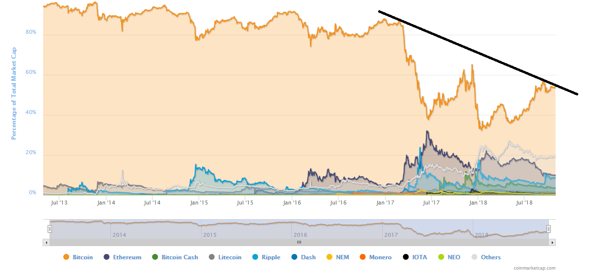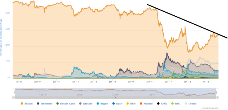 Ethereum (ETH) was calling the shots and the market was dancing to its tunes. However, as time went by, Ethereum (ETH) dominance continued to decline as Bitcoin (BTC) regained its dominance. The big moment for Bitcoin (BTC) came around July 2018 when Bitcoin (BTC) broke the dominance downtrend. However, soon afterwards, it got stopped by an even stronger resistance and thus the short lived belief that Bitcoin (BTC) had actually broken a dominance downtrend was nullified. Bitcoin (BTC) is about to run into the downtrend resistance again. If it is rejected this time, the fall in dominance will be a very swift one and other cryptocurrencies will soon fill the vacuum.