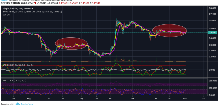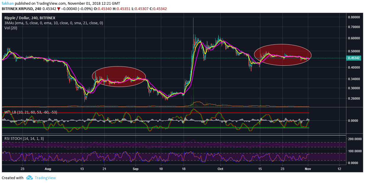 Just before the breakout during late August, we saw the 10 EMA break below the 21 EMA. The same appears to be happening this time. Interestingly enough, most technical indicators support such a move. The RSI Stochastic indicator on the XRP/USD 4H chart shows that the price has topped out short term and is ready for a move down. Wave trend analysis points to the same conclusion. If the price were to nosedive from current levels, it would be expected to settle above $0.30. The possibility and probability of a fall from current level is very real. There is still a slight chance that Ripple (XRP) may breakout from here to the upside. However, any rally in consequence of such a breakout would not be sustainable.