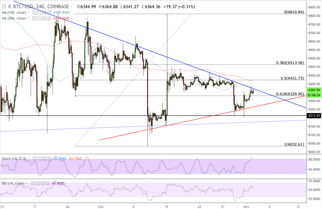 There was a brief attempt to invalidate a key bearish trendline depicted in blue in the chart above. But BTC/USD pullback validated a mildly strong selling sentiment near that area. As of now, the bulls are not giving up and are attempting to break above the said trendline, which could allow the pair to gain further momentum towards 6421-fiat, the next upside target for day traders. It should be possible once BTC/USD moves above its 100-hour simple moving average, with a run towards the 200-hour moving average in view – which would somewhat coincide with 6421-fiat.