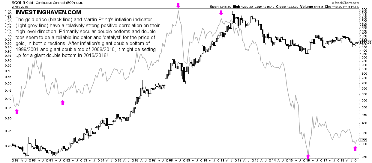 The gold price (black line) and the inflation indicator (light grey line) have a relatively strong positive correlation on their high level direction. Primarily secular double bottoms and double tops seem to be a reliable indicator and ‘catalyst’ for precious metals prices, in both directions. After inflation’s giant double bottom of 1999/2001 and giant double top of 2008/2010, it might be setting up for a giant double bottom in 2016/2018!