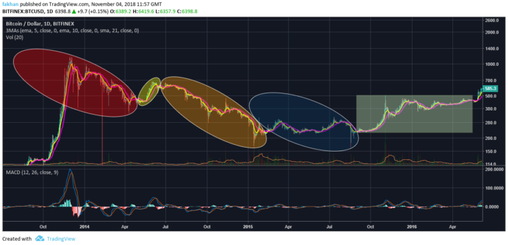 The above daily chart for BTC/USD shows the correction during 2014. We have divided it into five segments. The first segment shows an aggressive fall from Bitcoin (BTC)’s all time high. The second segment shows a ray of hope where some investors think that the correction is over. The third segment shows continued correction. The fourth segment shows the possibility of a reversal. The fifth segment shows preparation for a trend reversal. All of these segments are part of a full correction cycle for Bitcoin (BTC). As the chart shows, Bitcoin (BTC) starts to rally around mid 2016 and later reaches its all time high near $20,000.