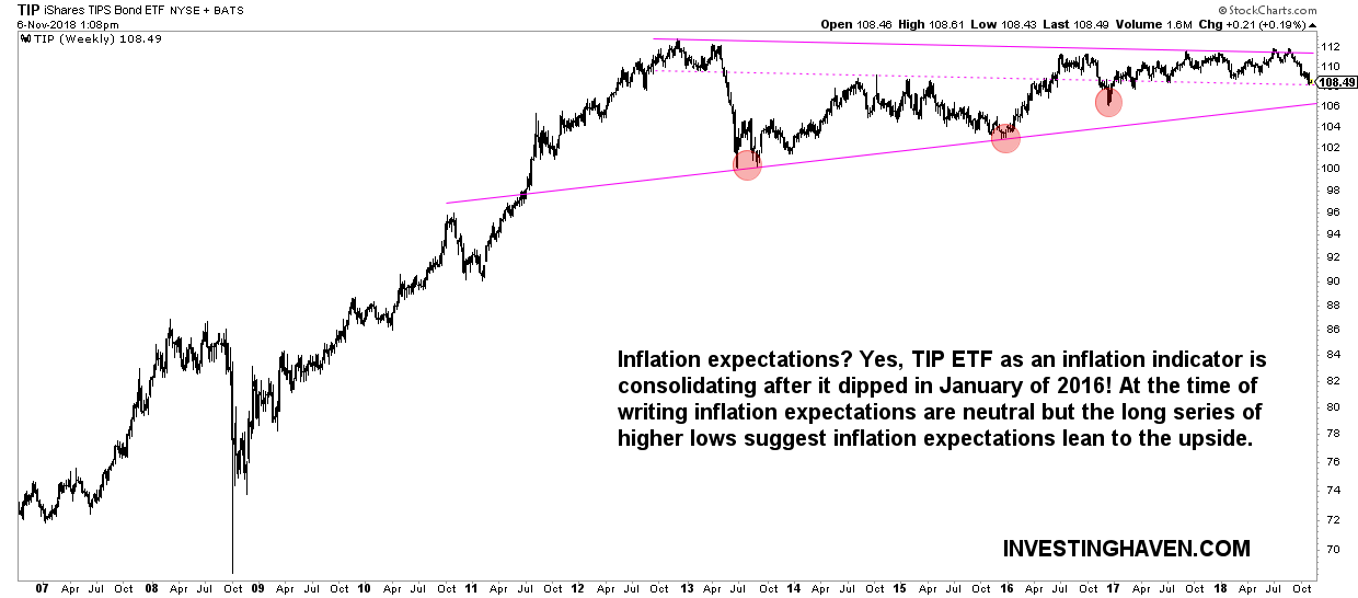TIP ETF was rising strongly until 2012. Since then it trades in a giant triangle with, primarily, a series of higher lows (annotated with the small red circles on below chart).