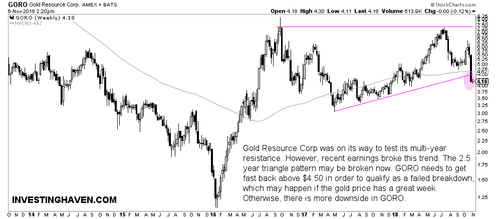 The weekly chart looked gorgeous until last week. With the sell-off the price of GORO dipped below its beautiful triangle pattern. It even dipped below its long term moving average.