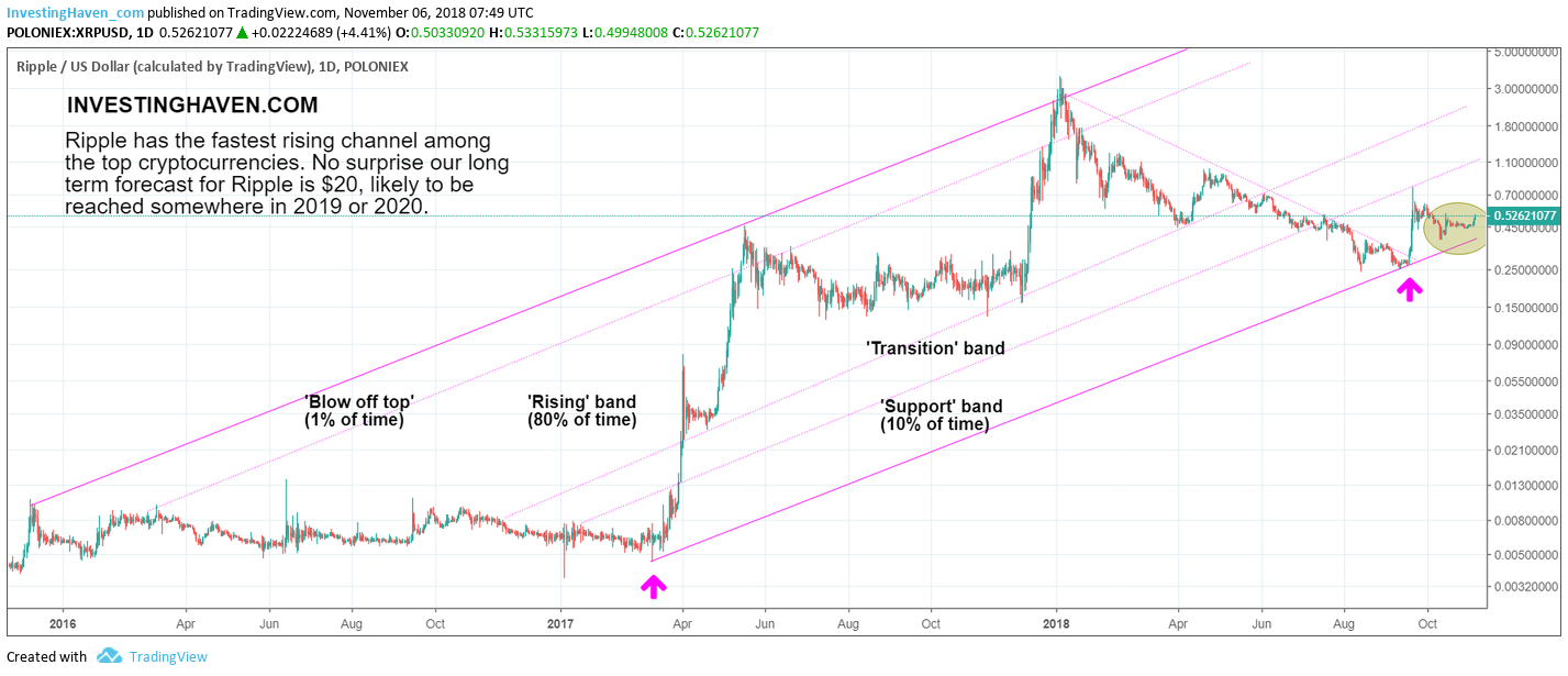 This pattern seems simple, but make no mistake it is incredibly powerful. The fact that Ripple built a long base throughout 2016 which was the basis for its rising trend channel is exceptionally strong. Hardly any cryptocurrency chart has the same setup. That’s why we consider Ripple having the most beautiful cryptocurrency chart setup going into 2019.