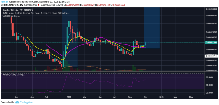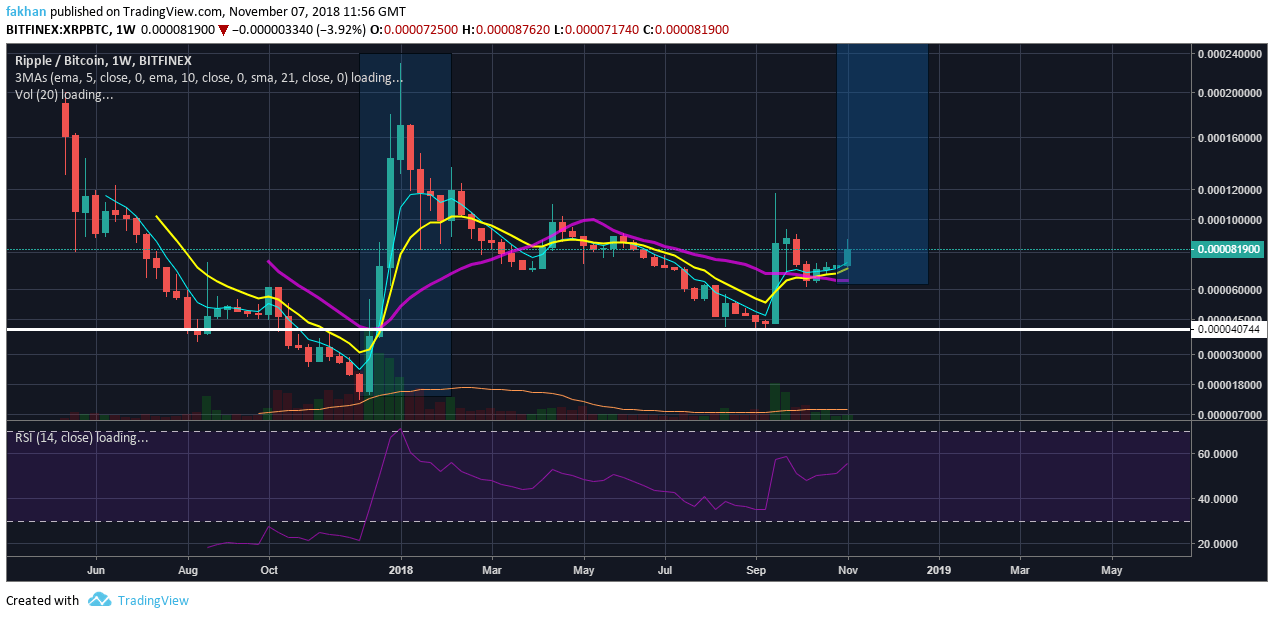 Ripple (XRP) has cleared its way against Bitcoin (BTC). The weekly chart for XRP/BTC shows that Ripple (XRP) has broken above critical EMA resistances and is now clear to take off. During Ripple (XRP)’s last cycle, we saw it forming four consecutive candles against Bitcoin (BTC) and made a new ATH. This pattern has also been repeated in the past and is very likely to be repeated again this time. If Ripple (XRP) were to form four consecutive candles this time, it is likely to break above a price of 0.00024 BTC and create a new all time high. At its current pace, Ripple (XRP) would be expected to reach that all time high around March, 2019.