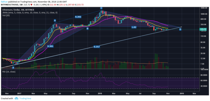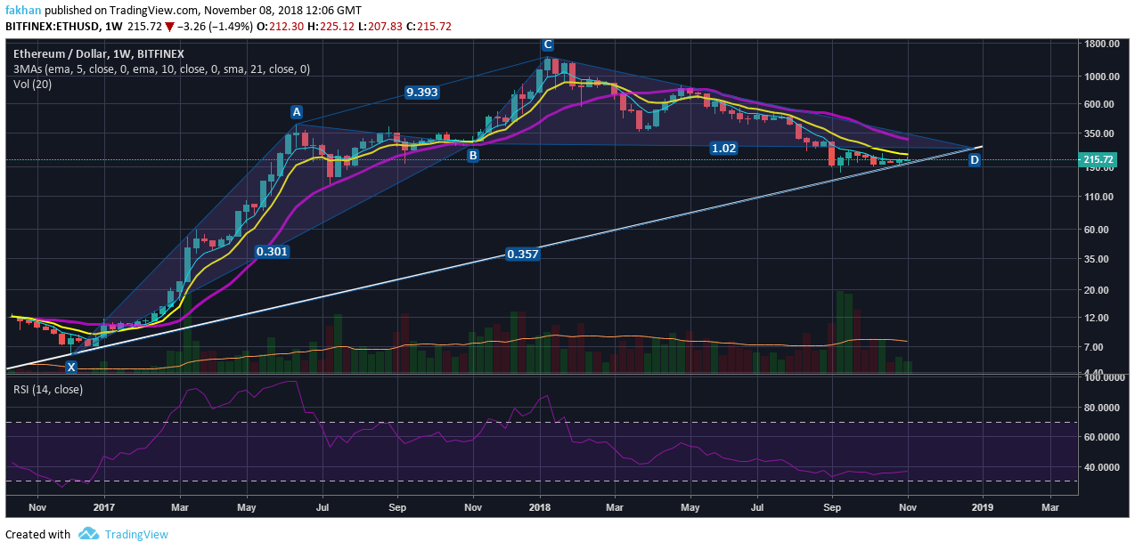 Most blockchain enthusiasts often mention how this technology is bigger than the internet or the dot com boom. Four years back, it would not have made much sense to many of us because we did not truly know what was possible. Today, we know what is possible and can see what is going to follow in the months and years ahead. The way cryptocurrencies and blockchain technology is bigger than the internet is that blockchain tokens or cryptocurrencies are not just like stocks issued by companies. They are also like currencies issued by governments and central banks. So, blockchain technology is targeting two trillion dollars markets, forex and stocks. Ethereum (ETH) being the largest smart contracts platform and a convenient mode of payment will be at the forefront of this disruption. The price of Ethereum (ETH) has already found a bottom against Bitcoin (BTC). The ETH/BTC weekly chart shows that the price has now broken out of the falling wedge and is likely to climb above the 10 Week EMA in the weeks ahead.