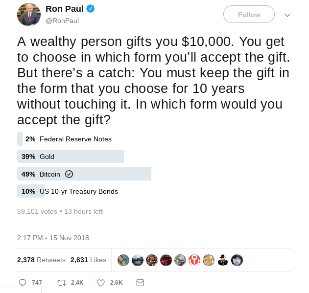 Most people would choose to invest in Bitcoin over gold, fiat currency, and bonds, according to a survey by Ron Paul which continues on Twitter November 16.