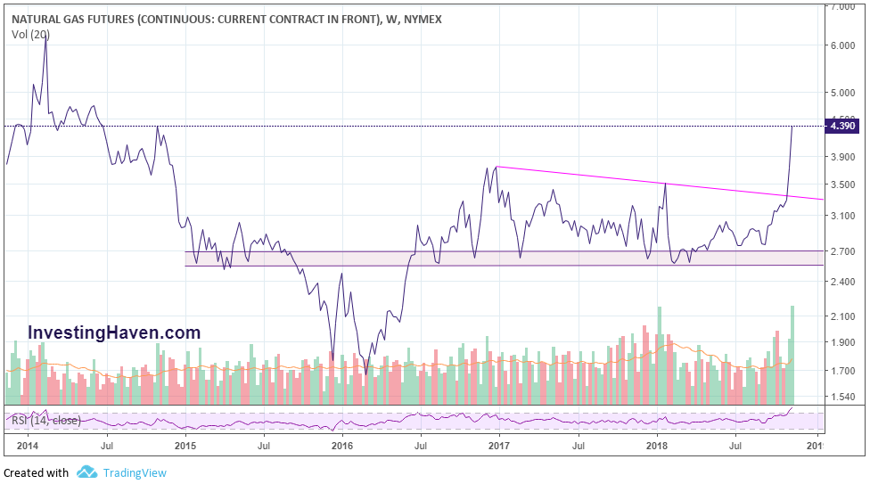 When you take a look at the natural gas price chart, you can clearly see that what happened this week was a break above an important resistance level from 2 years ago. Obviously, this break above resistance combined with the shortage news and what looks like a massive short squeeze fueled this run in natural gas price.