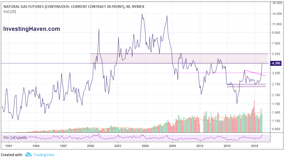 So that would be the first thing to look for to confirm the sustainability of the move upwards or if this is a false breakout. The next very important thing is the very long term chart of natural gas as shown below. Natural gas Long term price chart (23 years) shows a heavy overhead resistance at current levels.