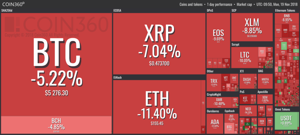 Bitcoin price slides another 5% today as the civil war raging within Bitcoin Cash continues to impact cryptocurrency markets and altcoins taking hits topping 10 percent November 19.