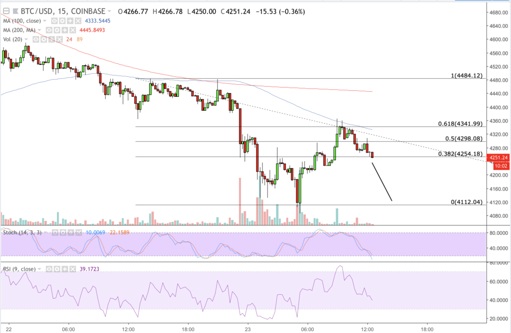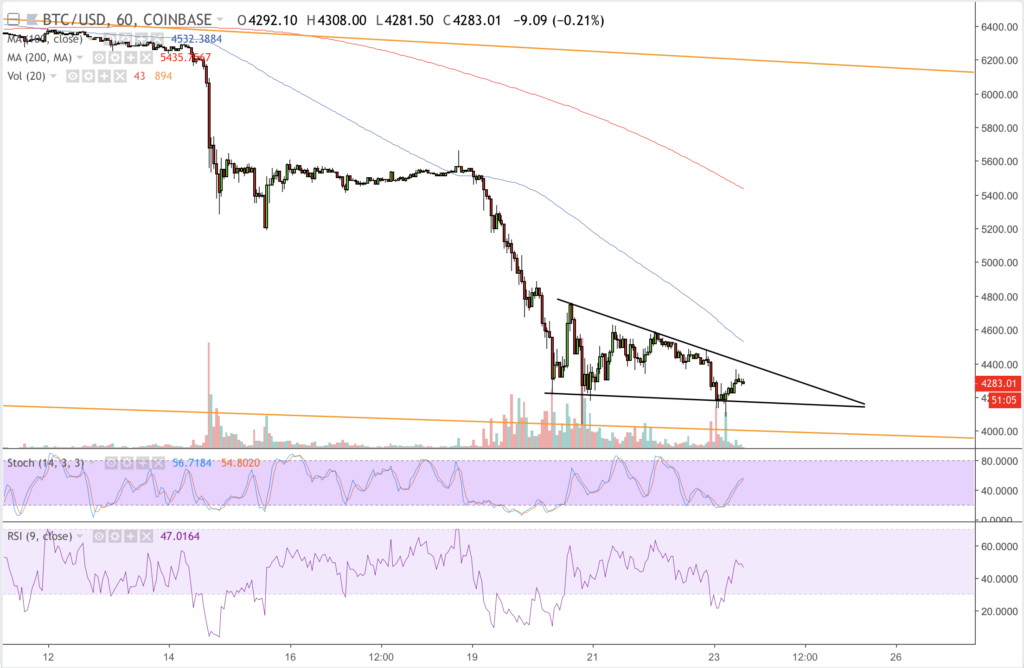 The BTC/USD rate is now trading at 4283-fiat, up 4.8-percent from its intraday low. The upside action is taking place as volume drops. It means that traders are showing no support to the move up, and the BTC/USD rate should fall. From a technical point of view, the pair is forming what traders call a bearish pennant. It means that traders are shorting their positions after the latest drop, leading BTC/USD to make lower highs and higher lows. Overall, the consolidation should meet a downside action.