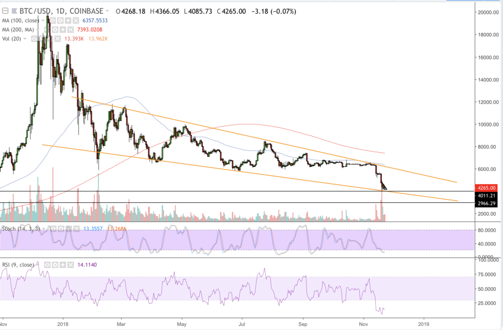 Technically, on the daily chart, the RSI has extended its stay inside the oversold area and the Stochastic Oscillator is hinting at a similar action. The BTC/USD index, meanwhile, is trending inside a giant falling wedge, as discussed in CCN’s previous analysis. A medium-term bullish correction could create long opportunities towards the intermediary target near 4500-fiat, leading to a full-blown recovery towards the wedge resistance, ensuring a breakout scenario towards the 200-period moving average.
