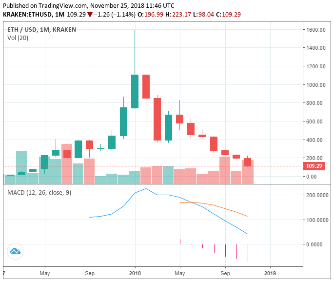 Ethereum (ETH), which is currently demonstrating a daily volume that is larger than that of Ripple (XRP) and Bitcoin Cash (BCH) combined at $2.2 billion, dropped to $98, falling to a double-digit for the first time since May 2017.