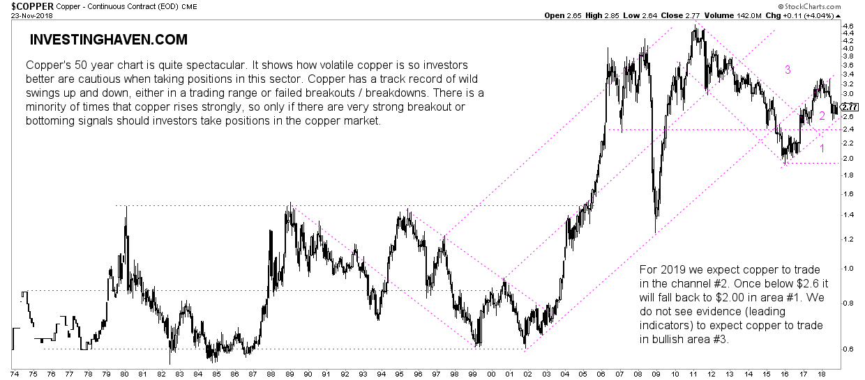 However, if the Euro breaks down we expect the copper price to fall in area (1) indicated on below chart. Our price target for 2019 would become $2.0 to 2.2.