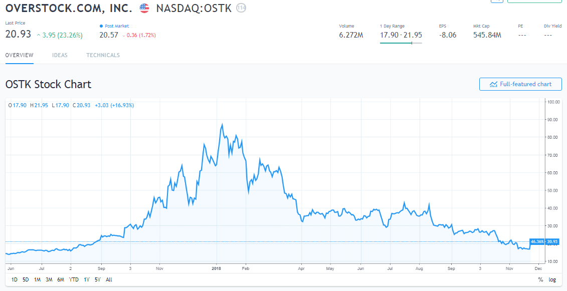 In a year that has seen Overstock’s share price fall 66 percent to date in line with the bearish performance of the crypto market, Friday’s announcement saw a 23 percent spike from just about $18 to more than $20.
