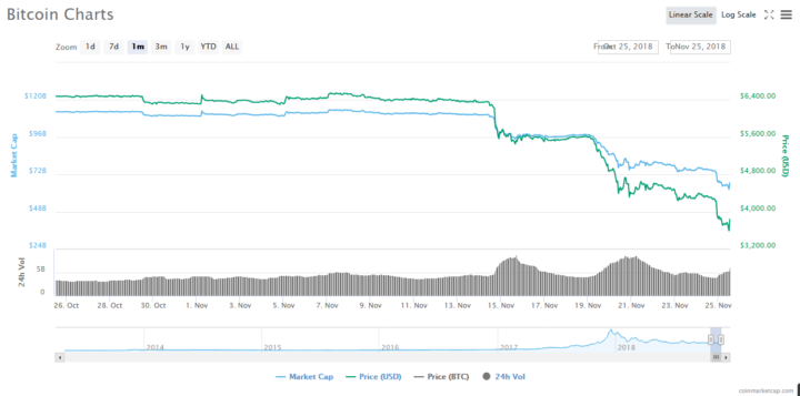 While bullish sentiments remain among many a commentator in the industry, the market slide continues. On Saturday (November 24, 2018), BTC fell below $4,000 to reach its lowest price since September 2017.