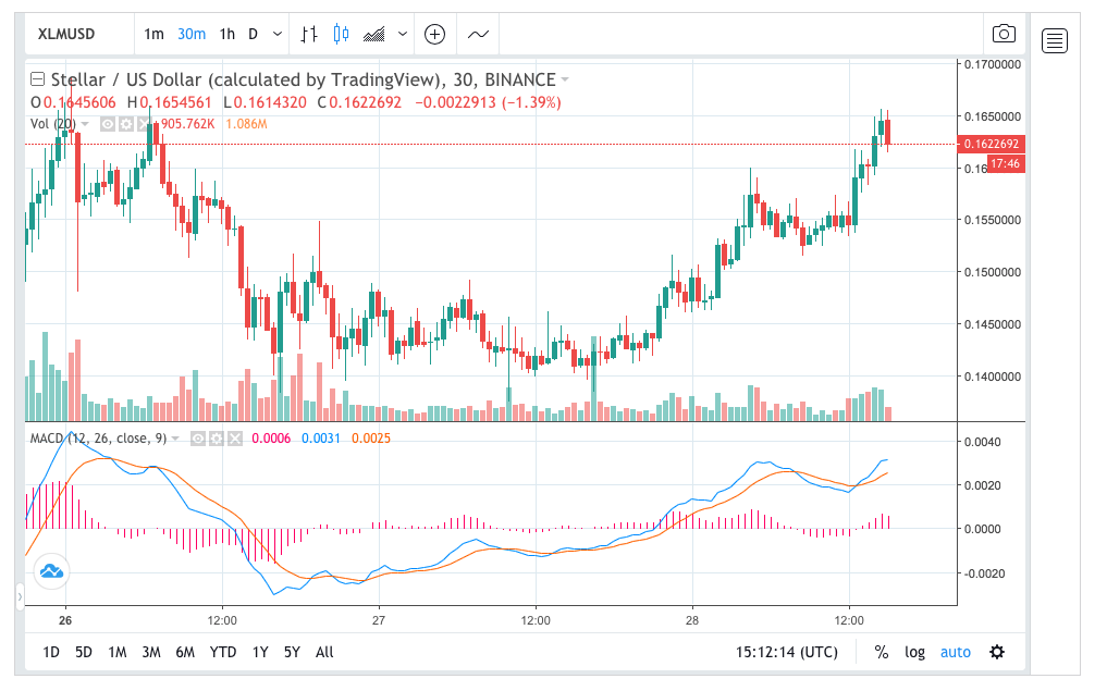 Stellar (XLM) price is up 15% against the dollar, with a 3% gain in Bitcoin valuation, over the last 24 hours. The cryptocurrency saw a 24-hour volume of almost $100 million in trading, with a gain in overall market capitalization roughly equal to that.