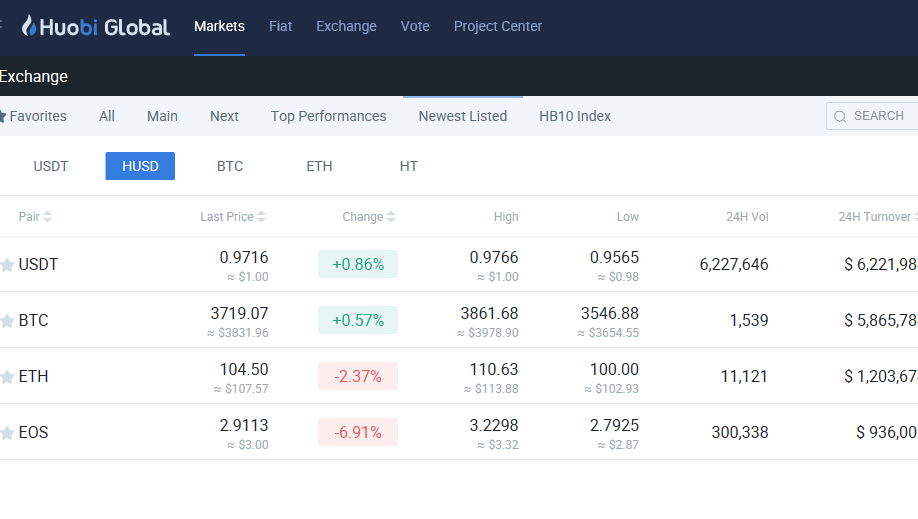 It seems Goodbody misspoke – according to the actual exchange at time of writing, the available pairs for HUSD were BTC, ETH, EOS, and USDT. It’s interesting that USDT is traded against HUSD, but not part of it. This is the second stablecoin effort that has decided to forego integration of USDT, which is the first pegged token.