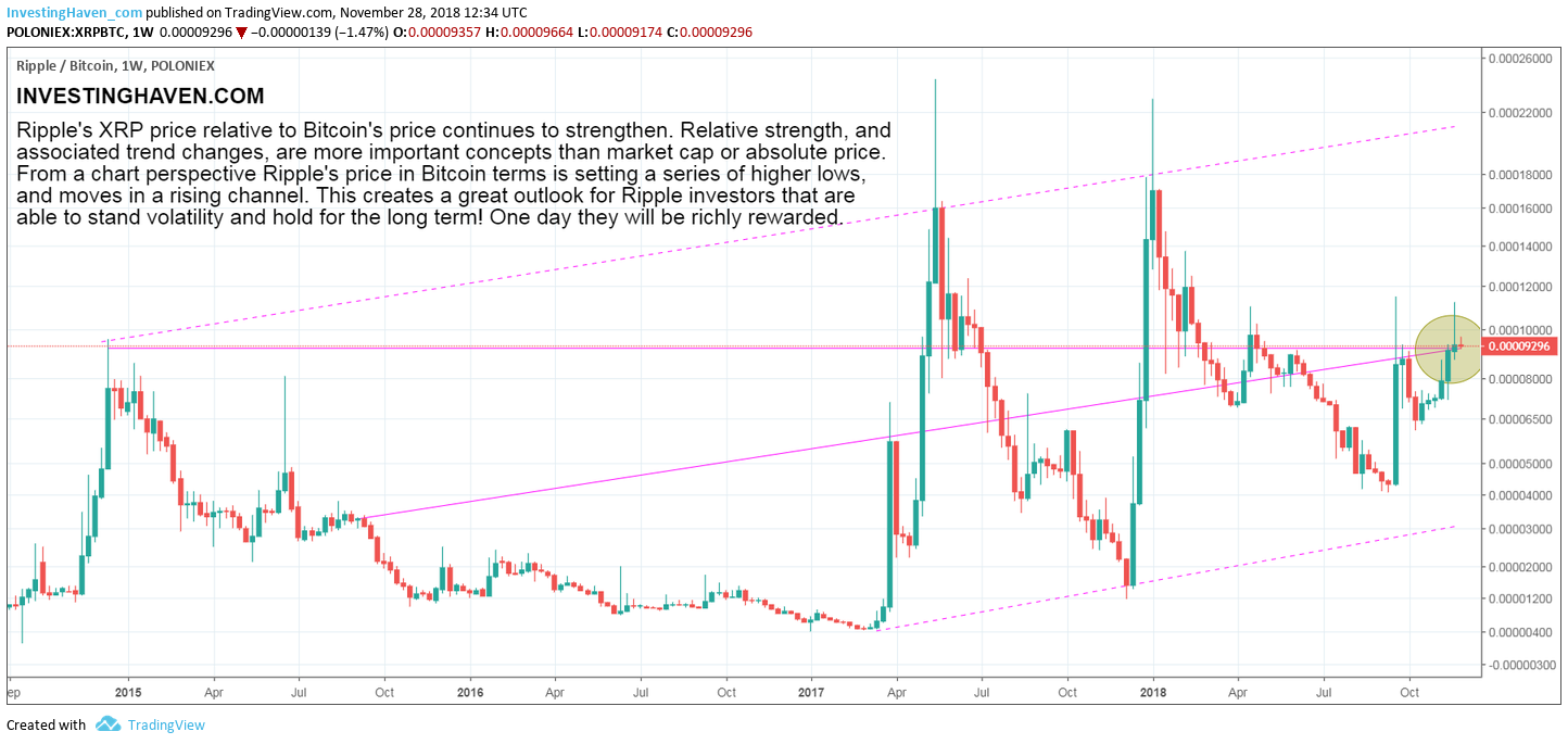 As per our Ripple price forecast 2019 we are strong believers that Ripple’s XRP token will rise to 20 USD. With the recent decline in the crypto space this price target might be delayed somehow. Regardeless whether Ripple meets our target in 2019 or 2020 the point is that it will be an outperformer, and might replace Bitcoin as the largest cryptocurrency in terms of market cap, as per our cryptocurrency predictions for 2019. We get additional evidence from our viewpoint from the Ripple relative strength chart which is included in this article.