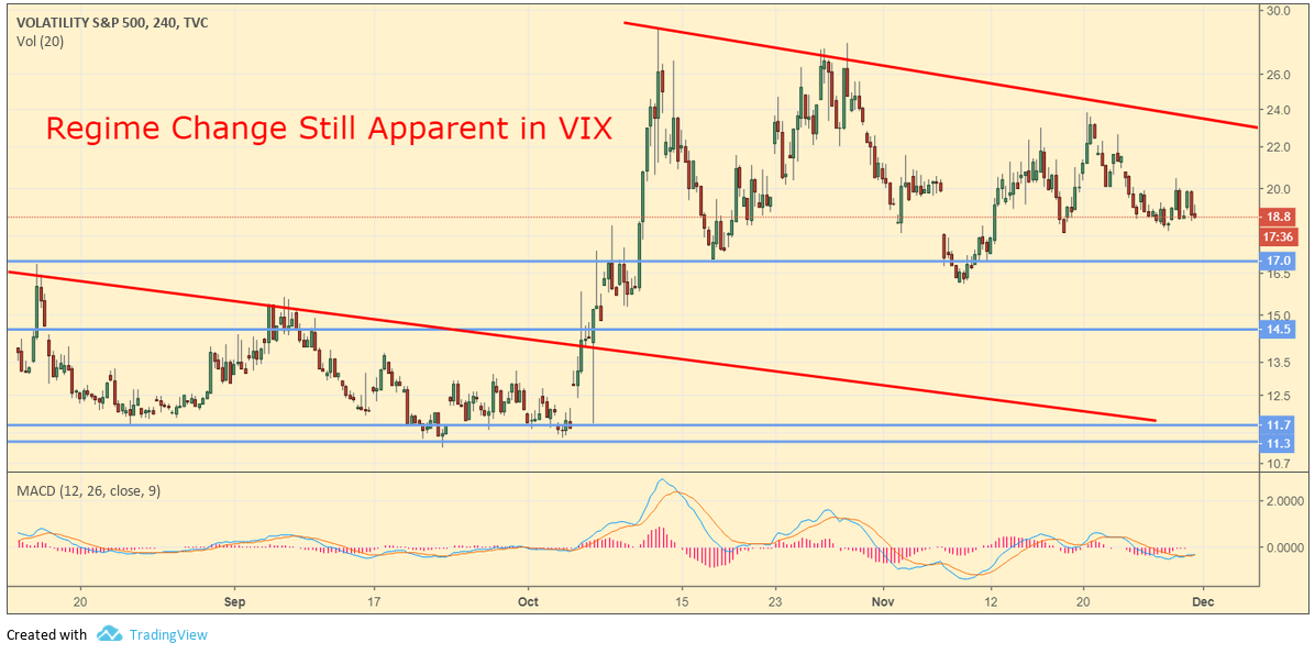 While the VIX could head south in December, in the illiquid holiday market, we expect the regime change to be persistent, even in the case of a larger scale risk rally following a possible trade deal between the US and China. With that in mind, all advances should still be treated as selling opportunities in stocks, and the VIX will likely not return to its pre-correction levels for a long time.