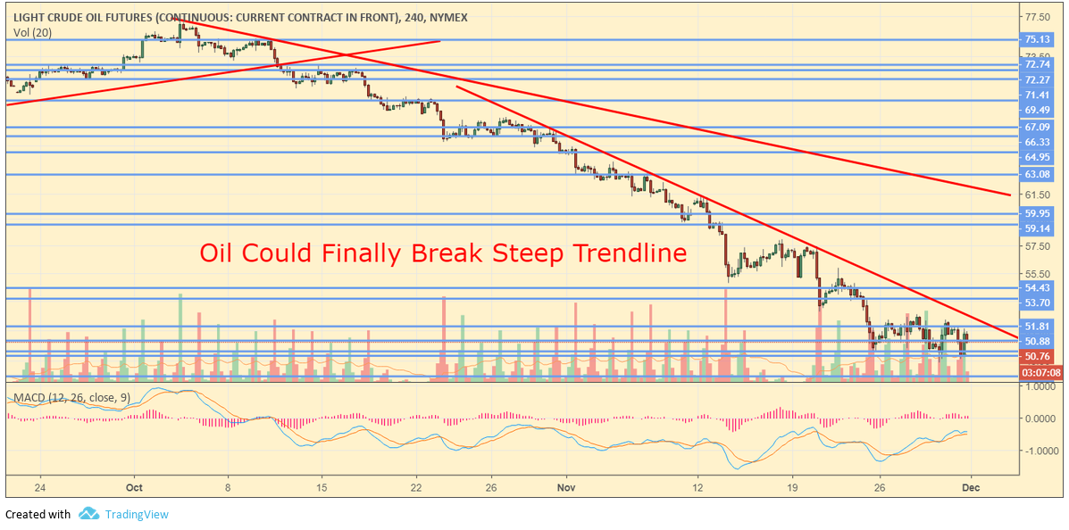 The WTI contract dipped below the $50 per barrel level once again today before another sharp rally attempt, but it is still clearly within the steep declining trend that has been intact since early October. Should Saudi Arabia and Russia agree on a supply cut ahead of the OPEC meeting, oil could finally break the trendline and enter a stronger correction, even as fundamentals remain weak for the Black Gold.
