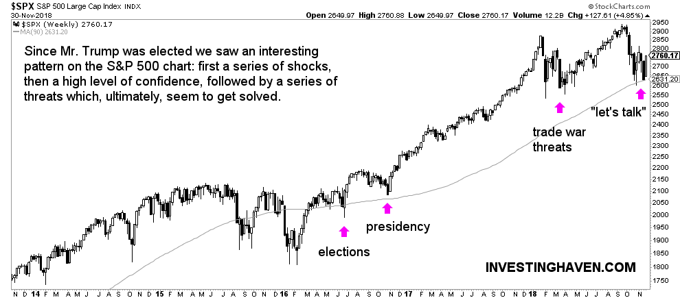 Fast forward to this year where we see a similar evolution. First there is a sharp sell-off which got introduced by talks of a trade war. It was more threats than anything else. Now, after a second sell-off this year, we see a recovery that is starting to shape up at a time when the president says he wants to talk with China.