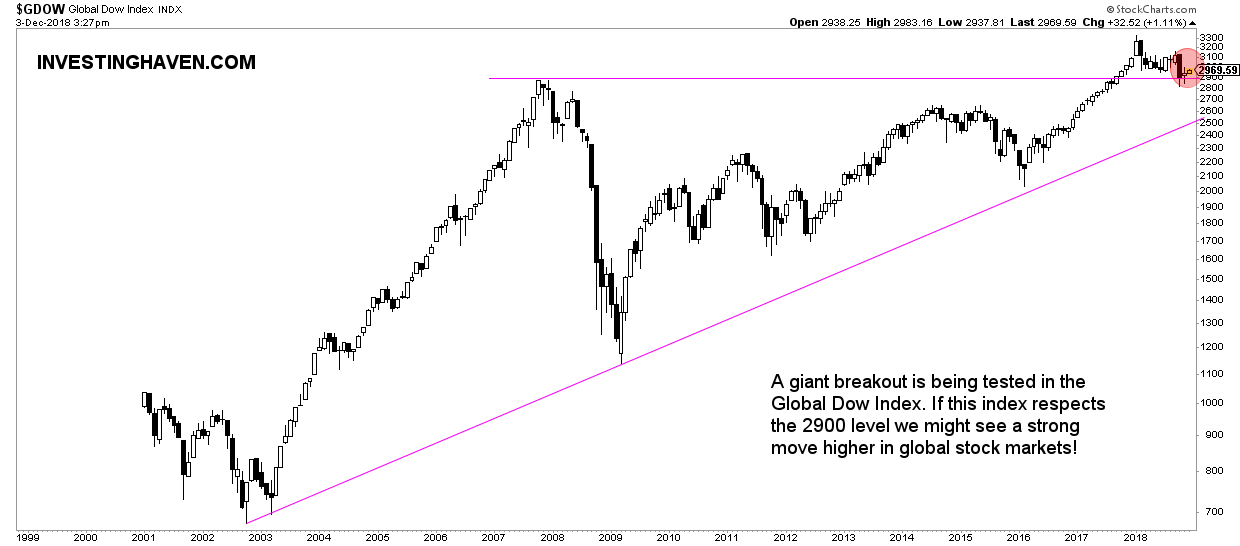 It might be that global stock markets are about to start a bullish cycle. How can we say this after such a tough and volatile year? Very simple, the global stock market index has a giant bullish chart setup which, if tested successfully, will get bullish energy. This might be the catalyst for our 5 top stock forecasts for 2019 as well as our emerging markets forecast for 2019.
