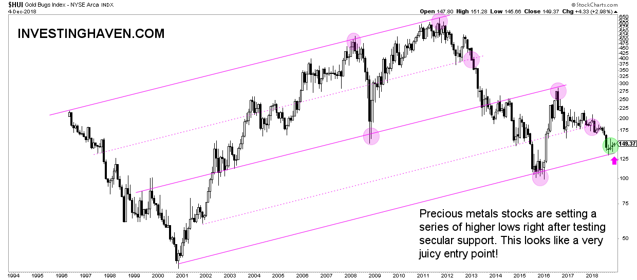 But from a chart perspective, especially the precious metals stocks sector and its long term trends we see an extremely interesting setup right now. Below is the HUI gold bugs index chart representing the precious metals stock sector. Note how secular support is tested for the 3d time on its 2-decade long chart. Note also how there is a series of higher lows in recent months.
