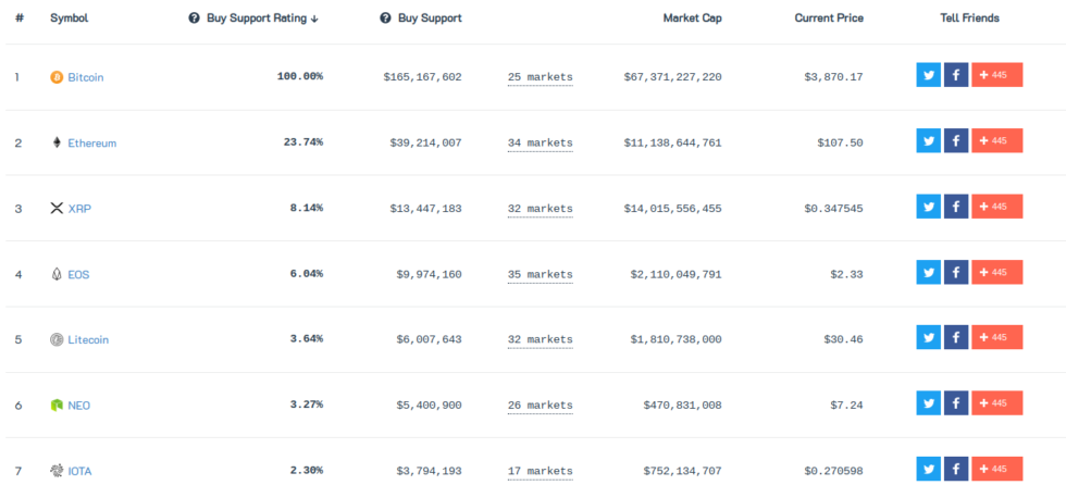 Focusing on buy support, which they explain as being the “sum of buy orders at 10% distance from highest bid price,” the resource ranks assets in a similar format to Coinmarketcap.