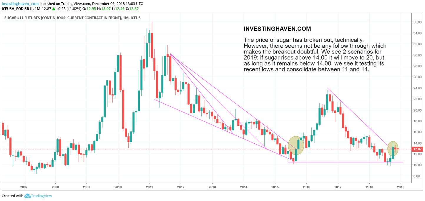 If we combine the supply/demand factors hinting at oversupply, our mildly inflationary environment and this weak breakout we certainly favor scenario 2 outlined above. In other words we have a neutral to mildly bearish sugar price forecast for 2019.