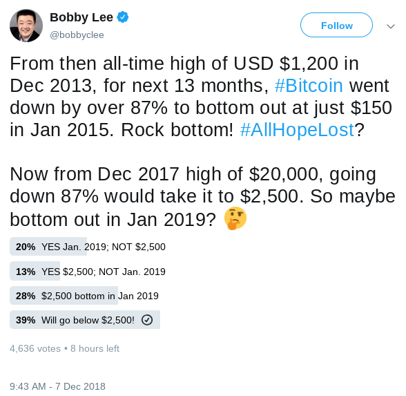 The Bitcoin price could “bottom” at $2500 in January 2019, BTCC co-founder Bobby Lee has forecast in his latest prediction which many traders already consider too optimistic.
