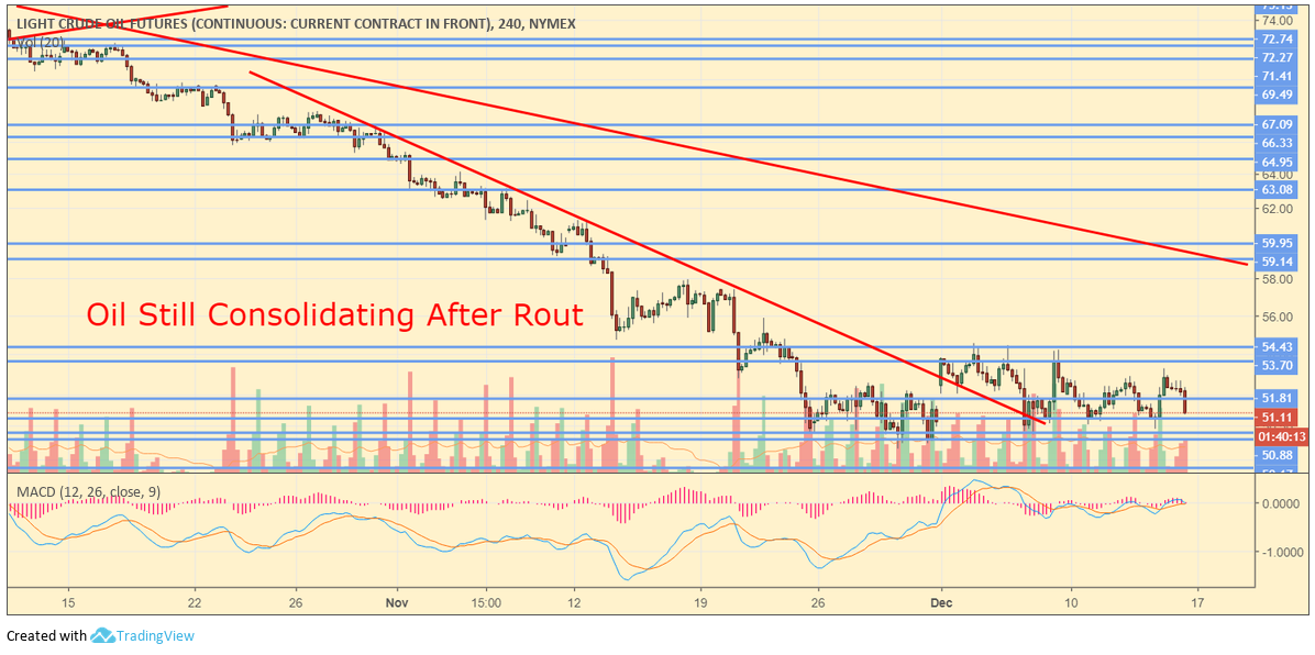 Another rally attempt faded away today in crude oil, and the crucial commodity continues to trade in a bearish consolidation range following the series of dead-cat-bounces. The top of the range is found near the $54.25 per barrel price level, while strong support is found in the $49.50-$50 per barrel range.