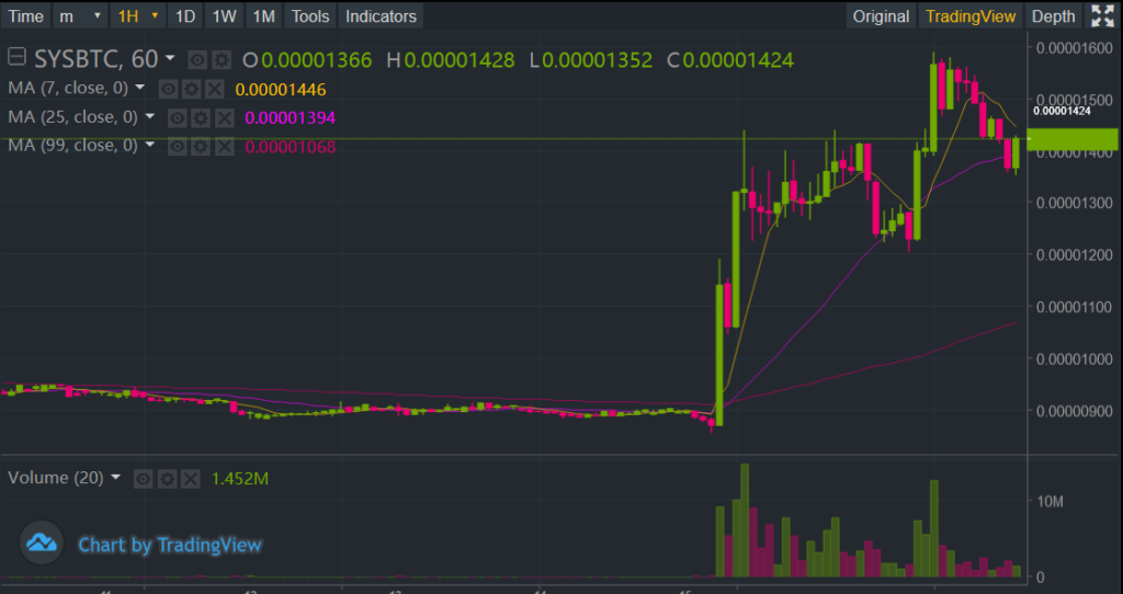 From a starting price of $0.029109 (883 sats) on Thursday evening, Syscoin jumped 76% up to $0.051509 (1579 sats), with the peak landing on Saturday morning. Several huge pumps from BTC traders on Binance kept the run going, as can be seen above.