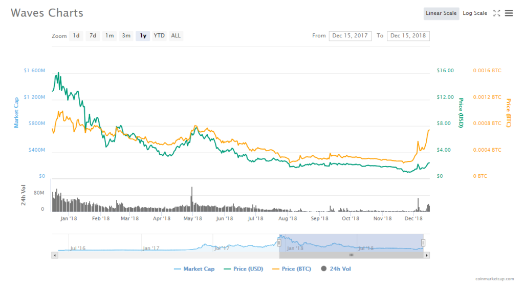 Since the end of November, the Waves coin (WAVES) has bucked a market trend and risen in price by over 150%. The cryptocurrency has not only risen to a price, at the time of writing, of $2.49 per coin but as bitcoin price falls, WAVES value against bitcoin (BTC) is also growing.