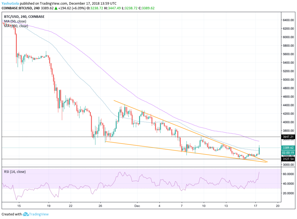 The BTC/USD pair at press time is trading at 3389-fiat, up 8.3% from its yearly low.