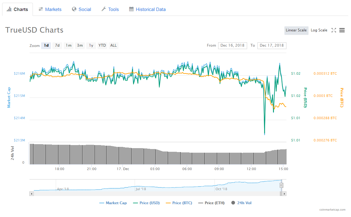 Paxos, like the Gemini Dollar, has received New York Department of Financial Services (NYDFS) approval. PAX market capitalization also fell back for a period today before recovering. It’s a similar story with the new TrueUSD (TUSD) stablecoin: