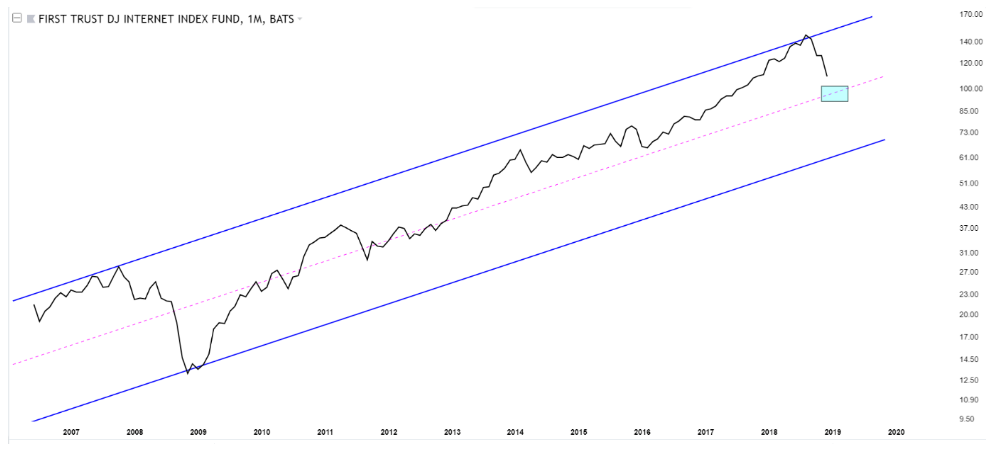 Tech stocks could lead the market to go down even further. The median line of monthly FDN chart will be a temporary resting place around 95 – 100, failure to hold could see price roll all the way to channel support.
