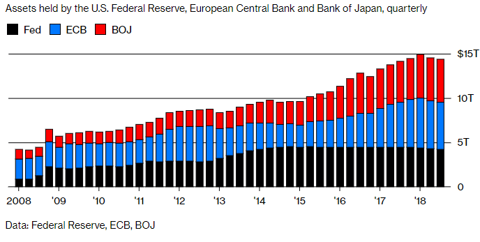 Bloomberg Economics declared October 2018 as the month the world’s largest central banks collectively started to decline their bond holdings. Though the ECB and BOJ are still scaling back rather than releasing holdings.