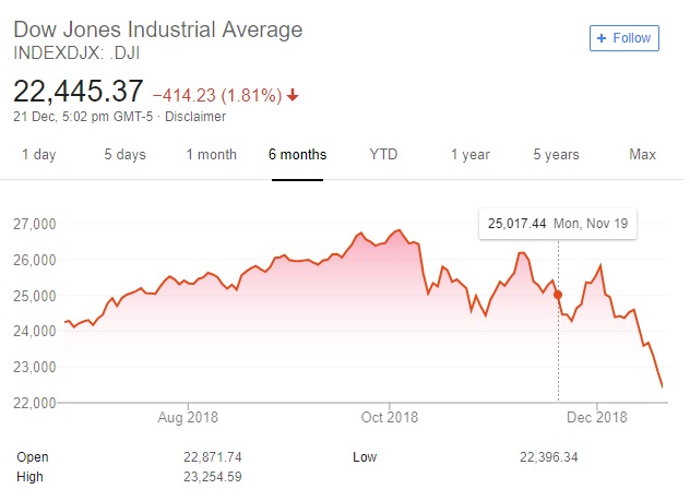 The Dow Jones has dropped by 16.3 percent from its all-time high at 26,828 points and is approaching bear market territory.