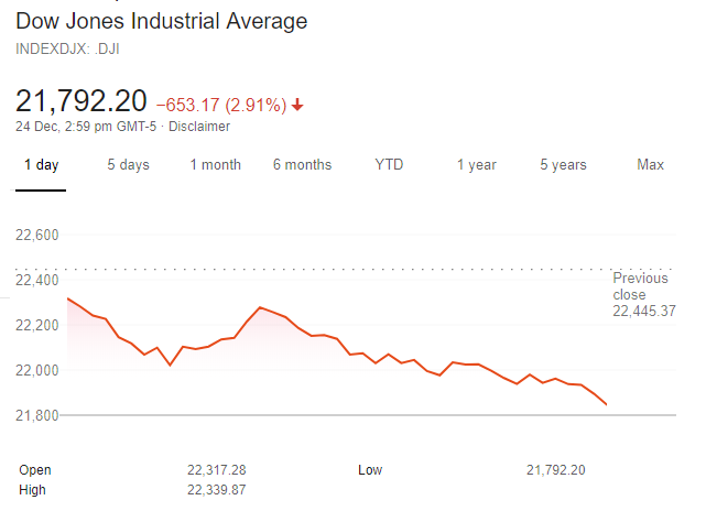 In the traditional financial market, a 20 percent decline from an all-time high is generally considered a bear market. Having lost 2.91 percent of its valuation on December 24, if the Dow Jones drops by a mere 1.5 percent or 300 points, it will officially be considered to be in a bear market.
